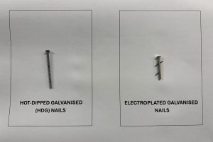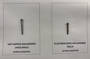 Hot-dip galvanised nails have a thick, dull, durable zinc coating compared to a thin, shiny layer on an electro-plated galvanised nail. As you can see from the images, after 6 months the electro-plated galvanised nail has started to corrode (which will create a rust run on the panel) however there is no change to the hot-dip galvanised nail after 6 months.